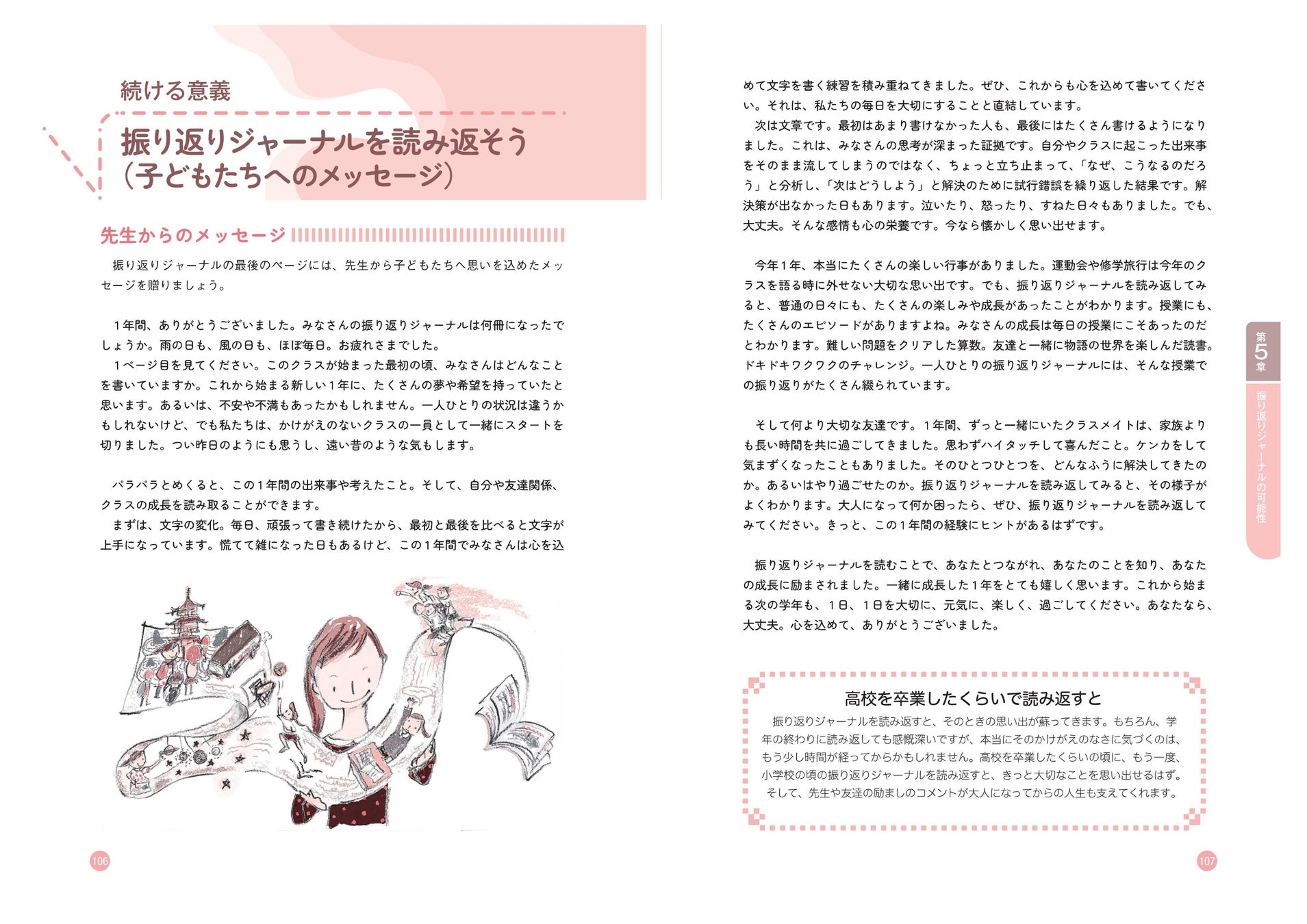 振り返りジャーナルは、さまざまな可能性を秘めた活動です。振り返りジャーナルを続けていくうちに、子どもたちの日常生活に工夫が表れ、自分や他者への理解が深まります。5章では振り返りジャーナルの発展的な内容を紹介します。