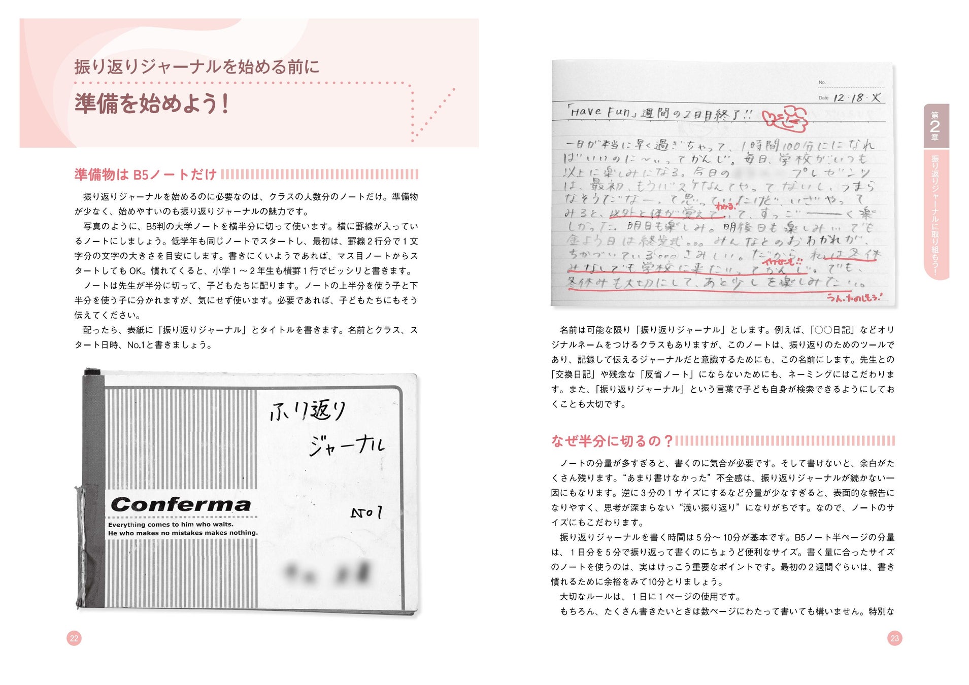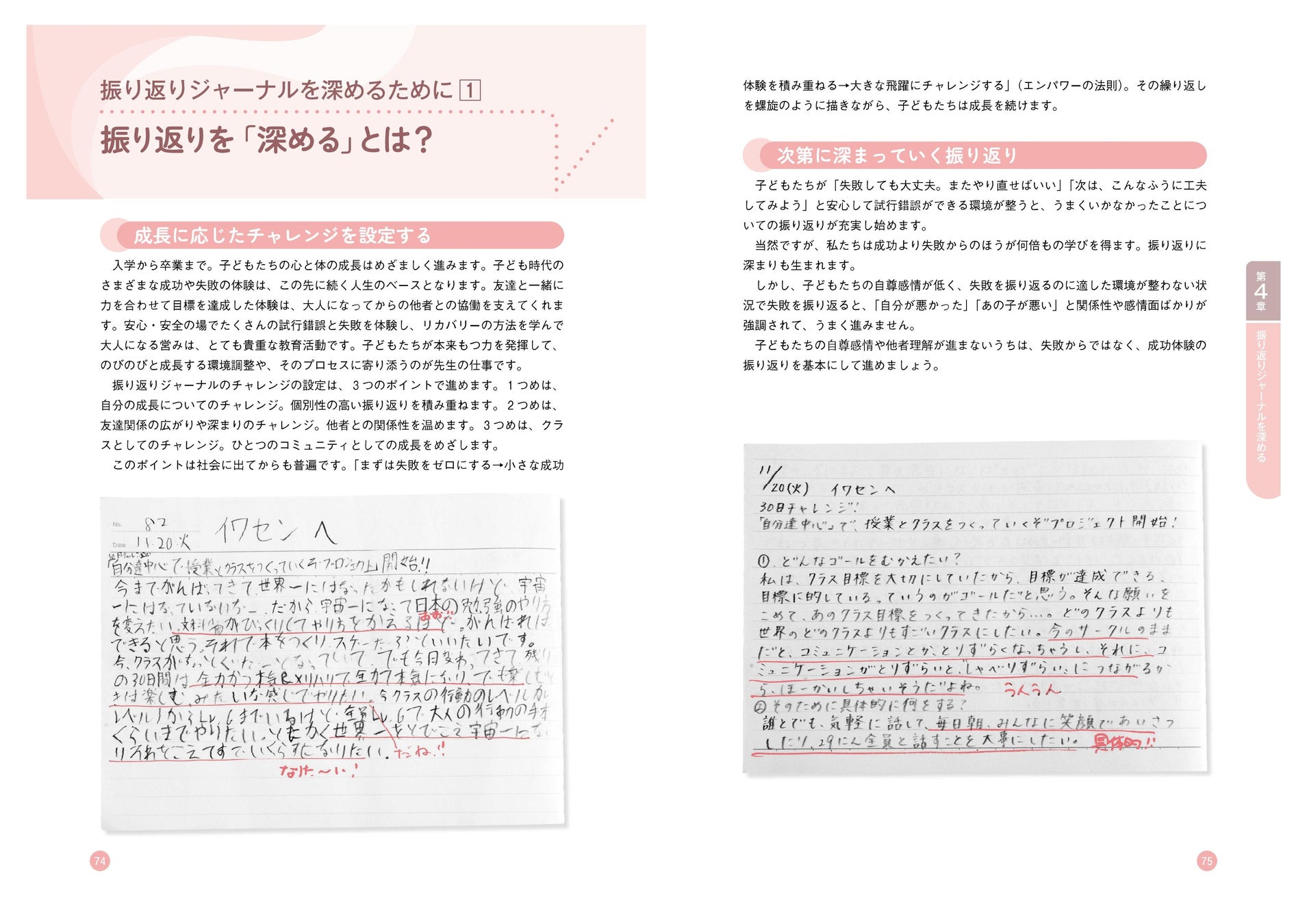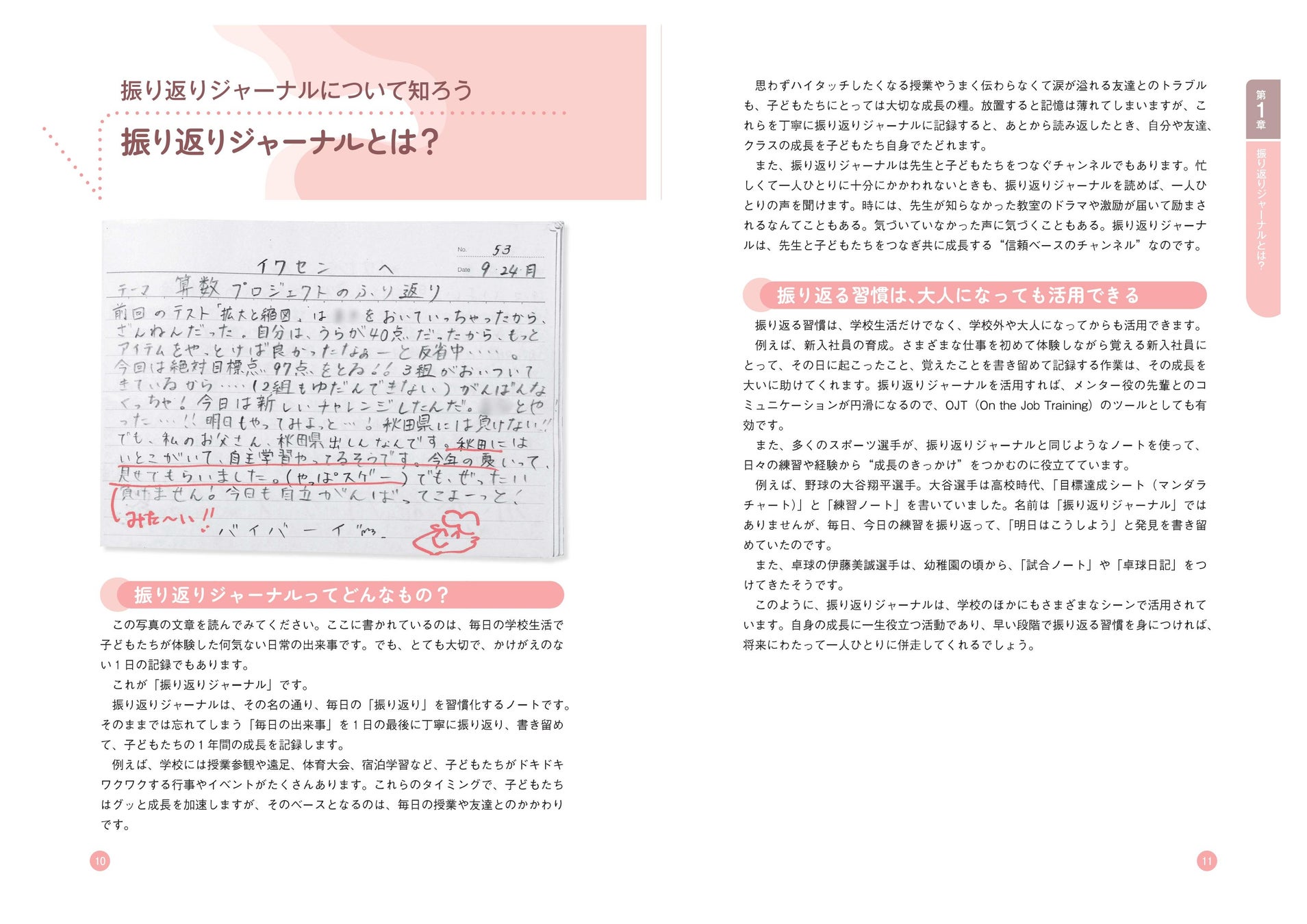 1冊を通じて振り返りジャーナルを体系的に学べるようになっています。