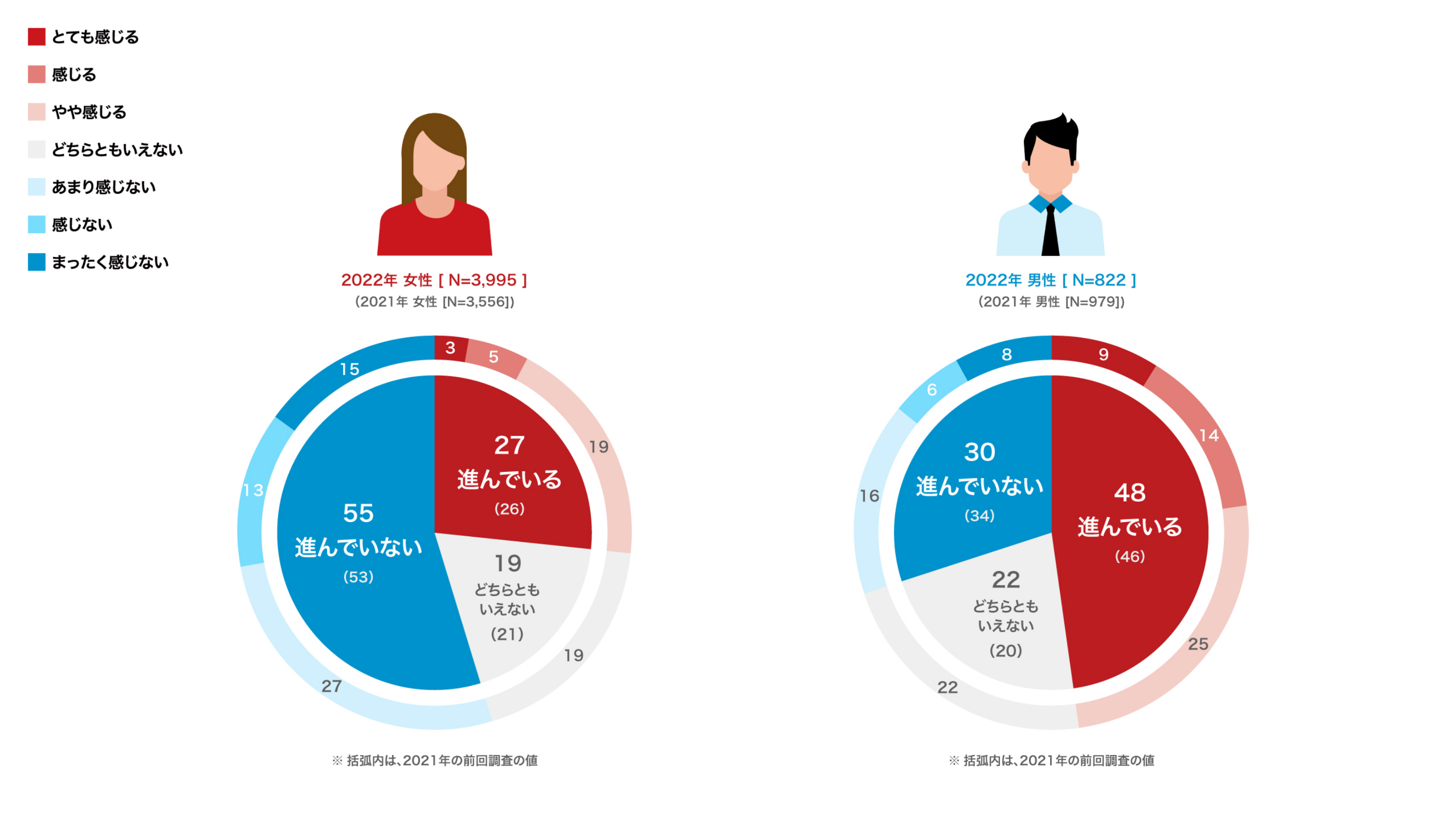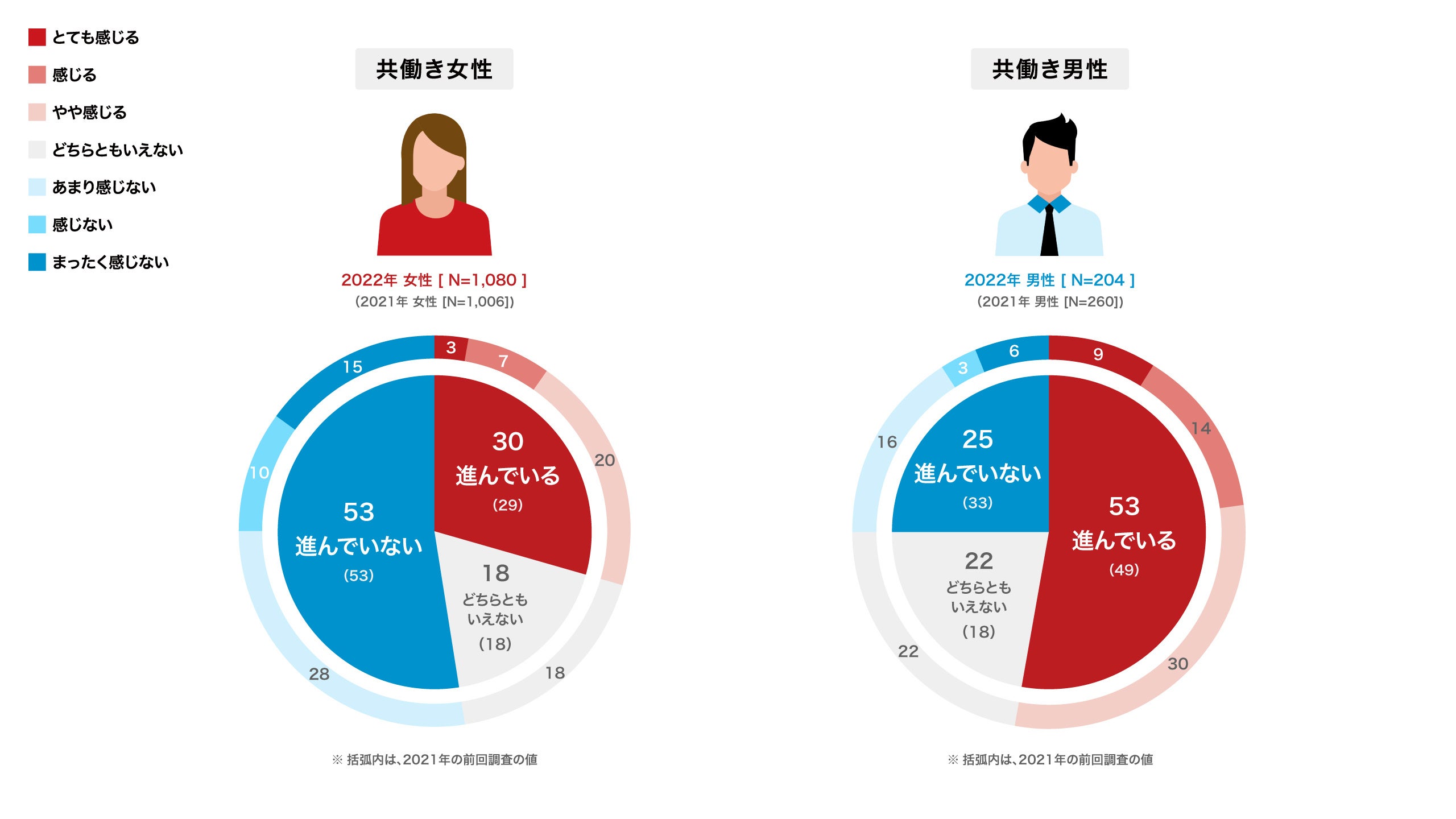 「女性が活躍できる社会づくり(働きやすい環境づくり)」が進んでいるという実感(とても感じる・感じる計)は女性で1割未満、男性でも3割未満と全体的に低く、性別差も見られる。共働き世帯の回答に限定しても同様の結果となり、「社会におけるジェンダーギャップ」が2021年も未だ解消されていないことが確認された。