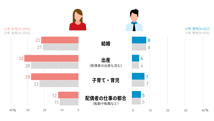 3)女性の2-3割は出産や育児・子育てがきっかけでキャリアを断念。(1年前と変わらず)