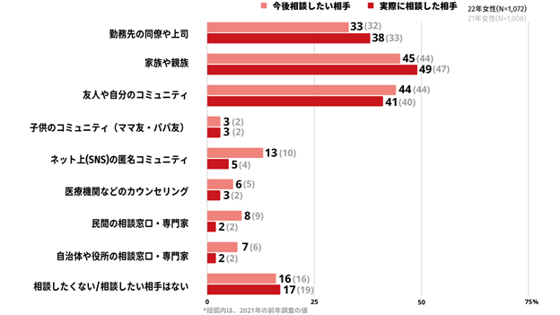 仕事に関する不安や悩みを相談できる相手は身近にいる「家族や友人」が大半を占める。前回調査と比較して、「仕事のやりがいやスキルアップ」や「仕事と家庭の両立」に対する不安や悩みを勤務先の同僚や上司に実際に相談する人の増加傾向が見られた。前回調査と同様、カウセリングや専門家のアドバイス、ネット上の匿名コミュニティを実際に利用したことがある人は全体の数%程度しか存在しないが、これらを今後利用したいと思う人は1割程度存在し、潜在的な期待・ニーズがうかがえる。「緊急の家事・育児代行サポート」のような人的バックアップだけではなく、「母親の社会的孤立や家事育児の悩みを気軽に相談できるアドバイザー・理解者の存在」を求める声が見られた。