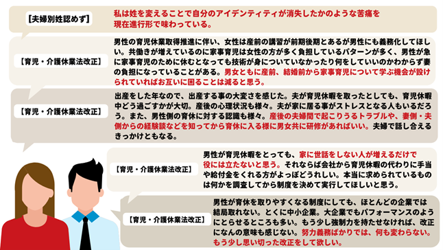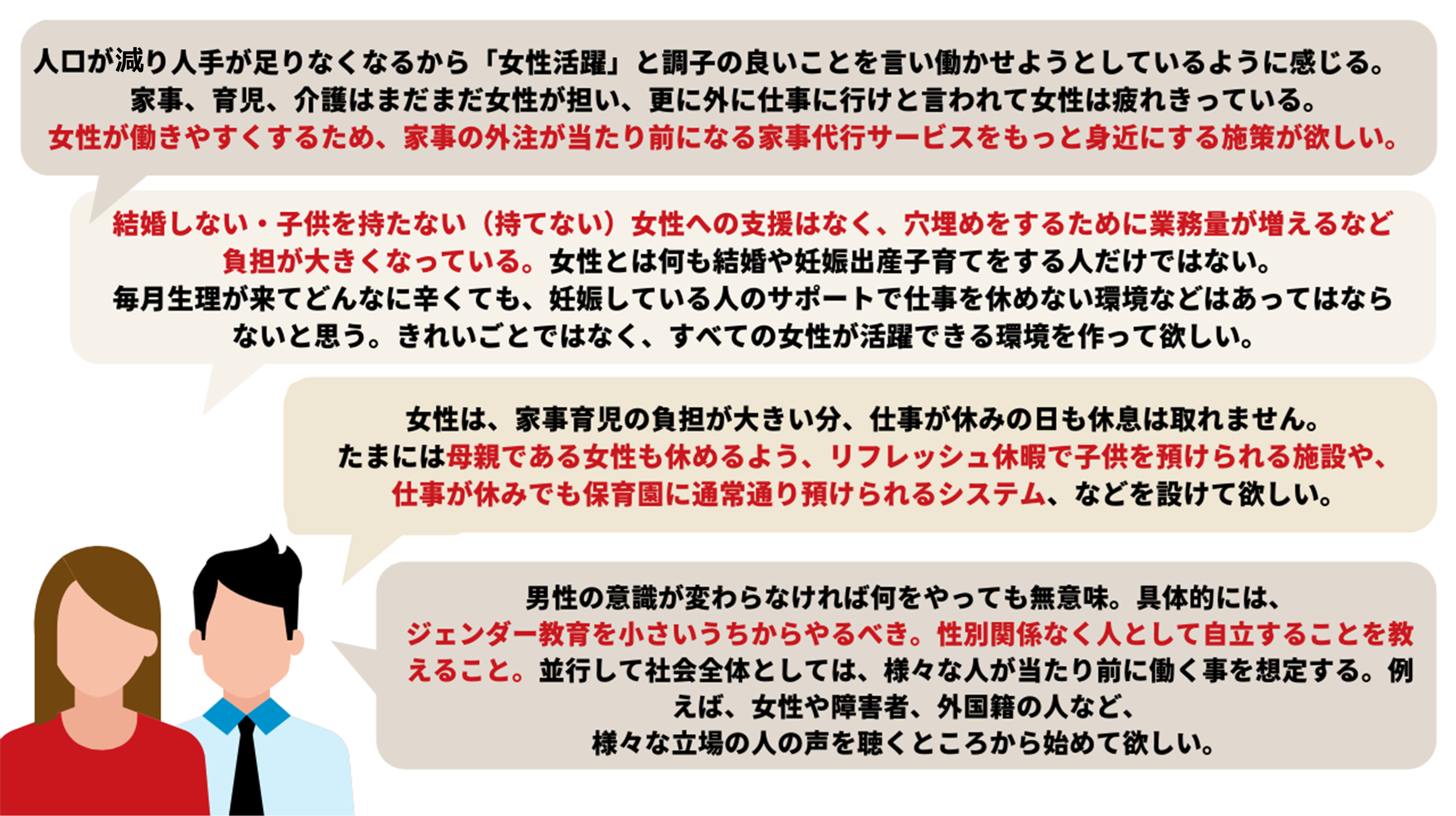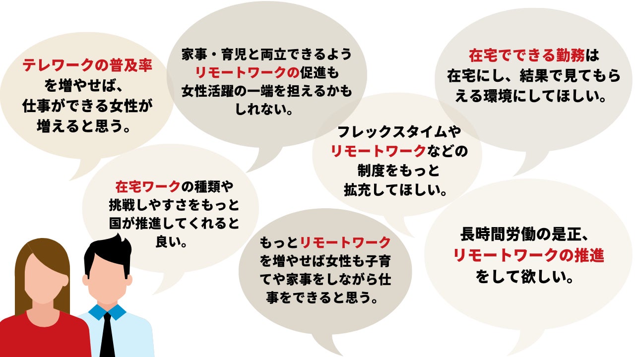 「託児所や保育園を増やす」といったハード面、「男性側の時短勤務や産休・育休取得の義務化・強制化」のようなソフト面の充実を求める声は変わらず多い。一方、コロナ禍によって「自宅でのリモートワーク主体」の働き方になった人は、家事や育児に対する負担軽減の恩恵を受けたという言及が目立った。