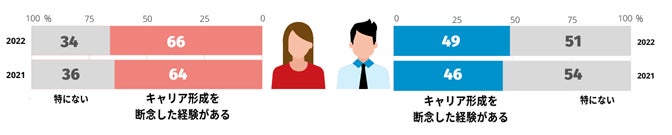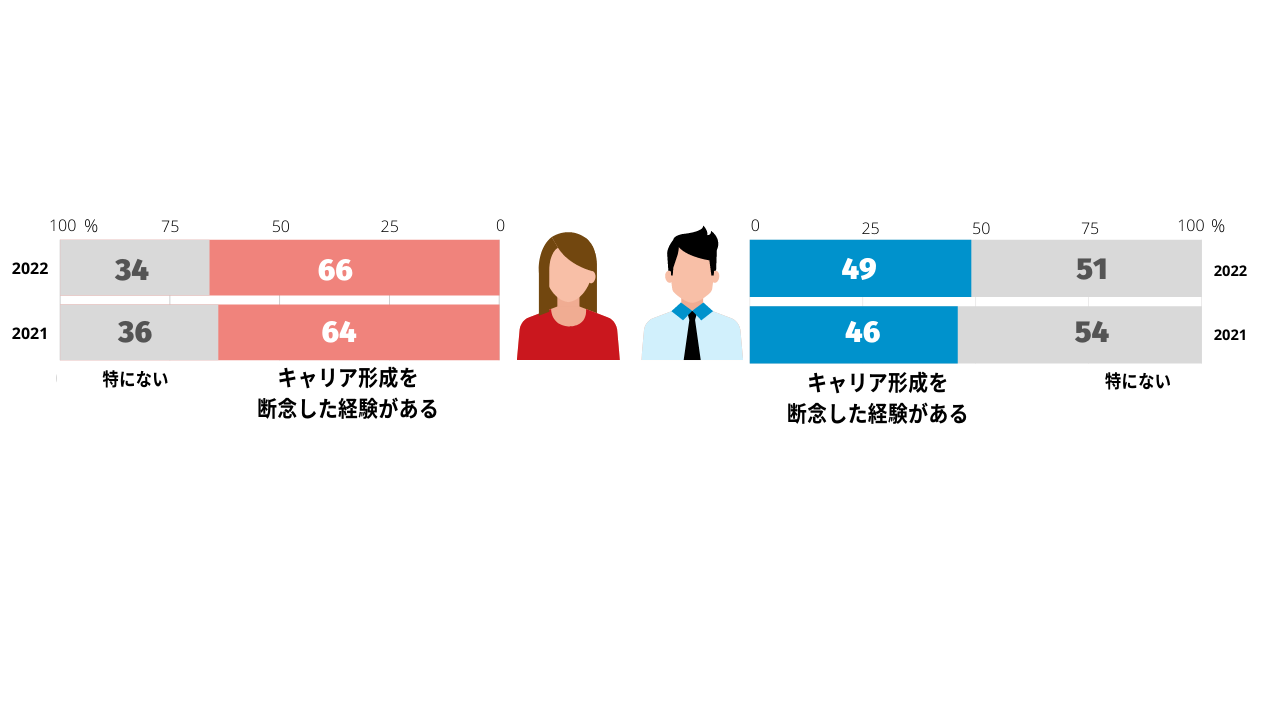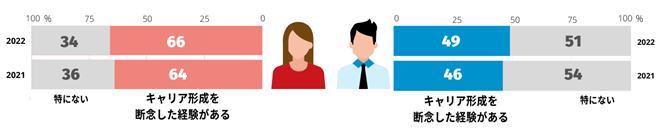 ・コロナ禍の長期化による先行き不透明感もあり、キャリアを断念するきっかけとして「出産(32%)」や「育児・子育て(28%)」が前回から5ポイント程度上昇。「配偶者や子供のサポート」は男性よりも女性が担っている状況。一方で、新たなキャリア形成への再挑戦意欲は昨年から9ポイント上昇し、68%に。リモートワーク推奨や法改正(育児休業法)など2021年の労働環境改善で選択肢が増える人も。「女性が活躍できる社会づくり」が進んでいる実感は男性で3割弱、女性1割未満と総じて低い状況が前年から続いている。