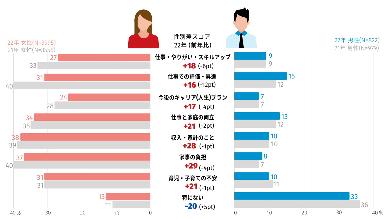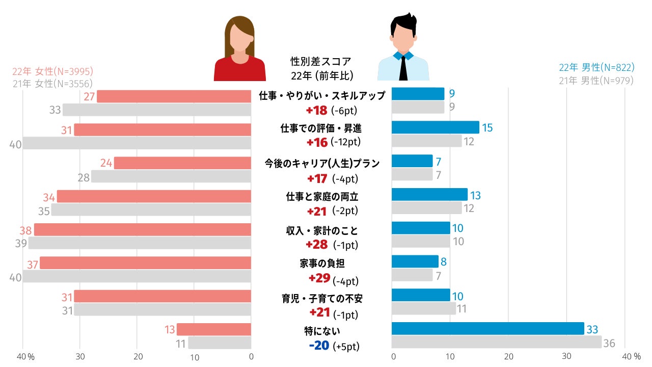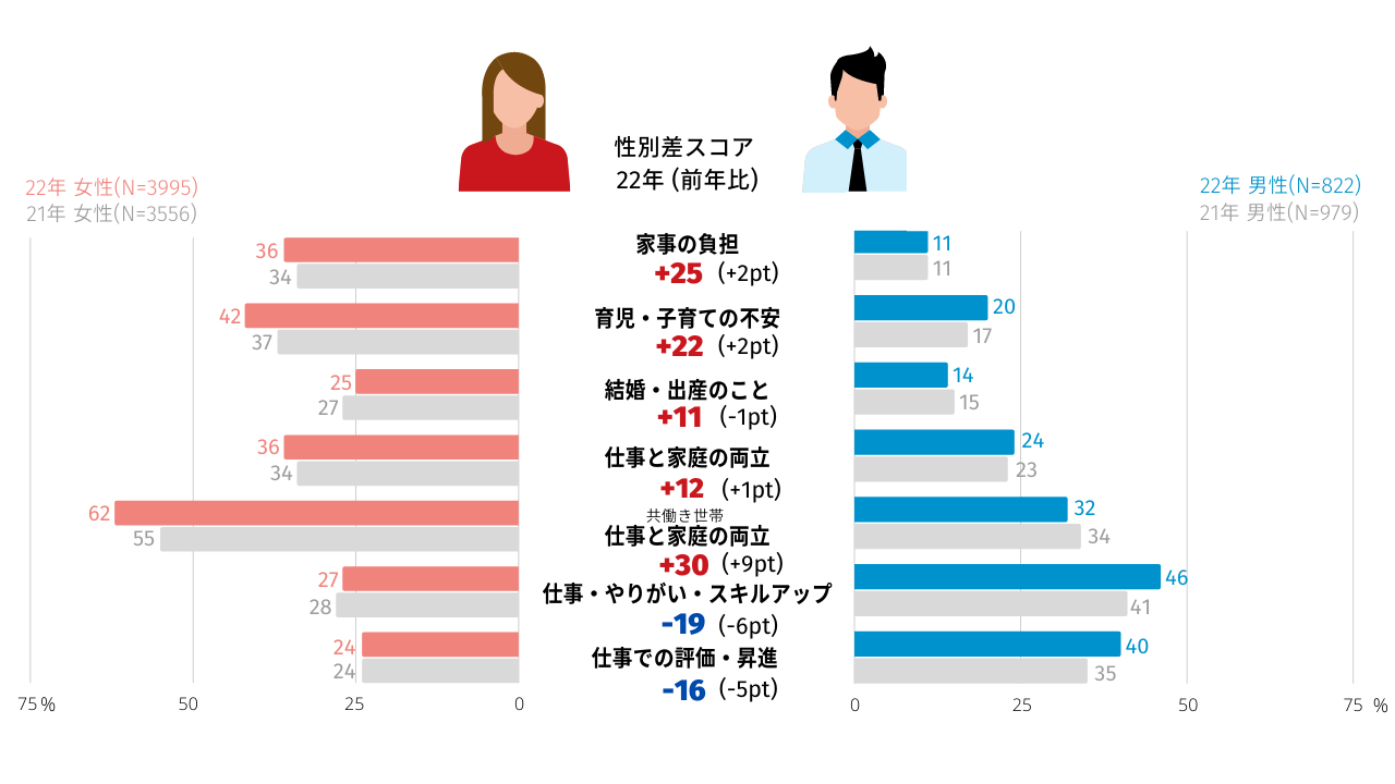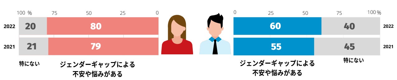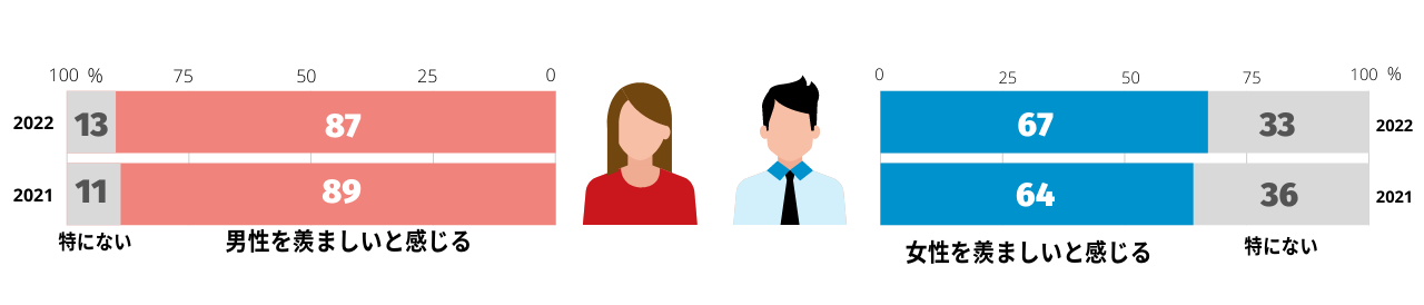 女性の約9割が「異性(男性)がうらやましい」と感じることがあると回答していることに加えて、ジェンダーギャップを起因とする不安や悩みを抱える人も前年よりやや増加し、8割を超えている。前回調査から女性で「仕事に対する評価」や「職場での人間関係」などは減少したが、「仕事と家庭との両立」「家事の負担」は継続して3割超と高く、「ジェンダー平等」が新語・流行語大賞のトップ10入りした2021年においても、意識改善が大きく進んだとは言えない状況である。