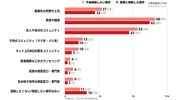 また、長期化するコロナ禍で、ジェンダーギャップに起因する日頃の悩みが増す中で、不安や悩みの相談にカウンセリングや専門家のアドバイスへのニーズはうかがえるも、それを利用している人が、未だに少ない状況。オンライン化の普及により、アクセスしやすい環境が整う中でも、利用に対するネガティブイメージや心理的バリア(経済的な問題も含む)は依然として存在すると考えられる。