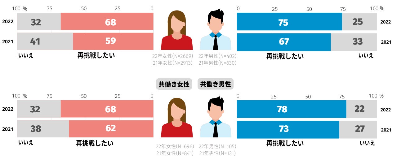 育休や産休などでキャリア形成を途中で断念してしまう女性の中で、勤務先への復職や新たなキャリア形成などに再挑戦しようと考えている人は全体の約7割にのぼり、この1年で大きく増加している。自由回答を見ると、コロナ禍をきっかけに「自宅でのリモートワーク」が働き方の選択肢の1つとして一般化したことが、家事と育児の両立や再挑戦への可能性につながっている様子が見られた。