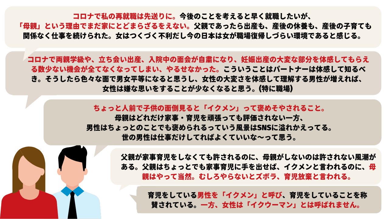 コロナ禍という状況下では、「夫や子供のことを優先せざるを得ないのは当然」という社会の風潮に対して憤りのコメントが目立ち、メディアやSNSに出現する「育メン(イクメン)」という表現からも、男性は「加点方式」、女性は「減点方式」で家事や子育てを評価されることに不公平感を募らせている。