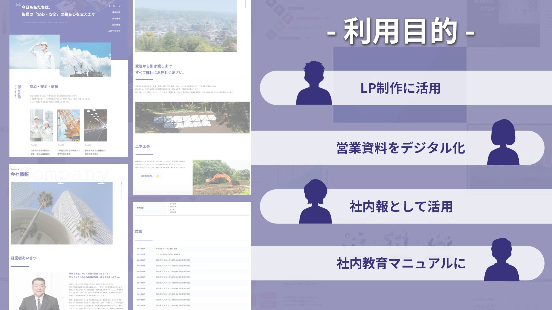 Slideflowは2022年3月にサービス提供を開始し、2023年1月時点で制作サイト数が 2,000 サイトを突破しました。Slideflowの利用目的は、自社サイト制作からイベントなどの特設サイト、社内報への活用まで多岐にわたり、あらゆる企業や団体が活用しています。