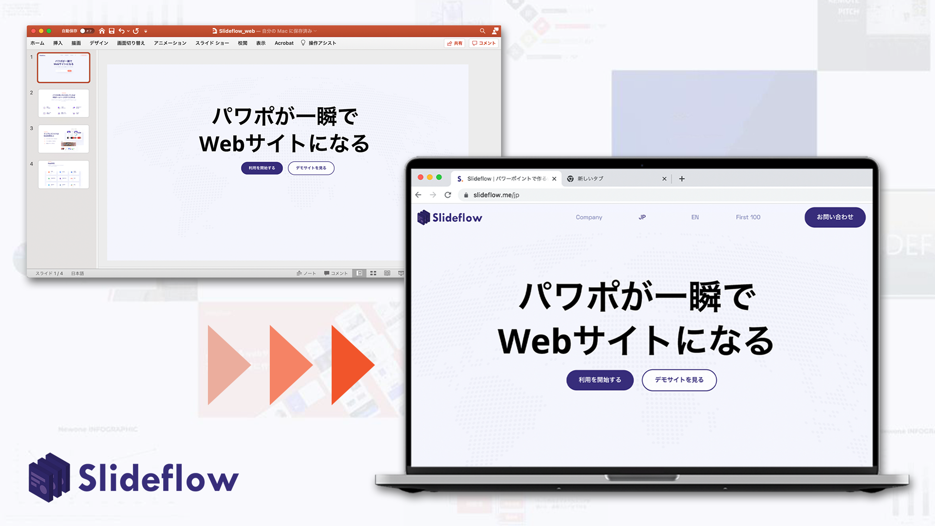 Slideflow(スライドフロー)は、プログラミングなどの専門知識がなくても、PowerPointやGoogleスライドで作成したデータを使えば、誰でもWebサイトを制作することができるWebサイト制作サービスです。スライドをアップロードしてから最短30秒でウェブサイトに変換でき、高度なサイト運用までを一貫して行うことができる世界初のSaaSです。