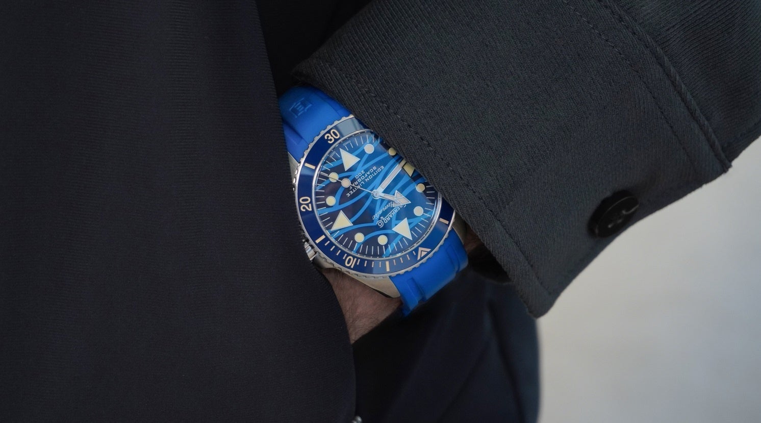 本モデルは、特別なブルーの文字盤が特徴で、水色の波模様が施されています。この波は、絶え間なく満ち引きを繰り返し、 時の流れを表しています。