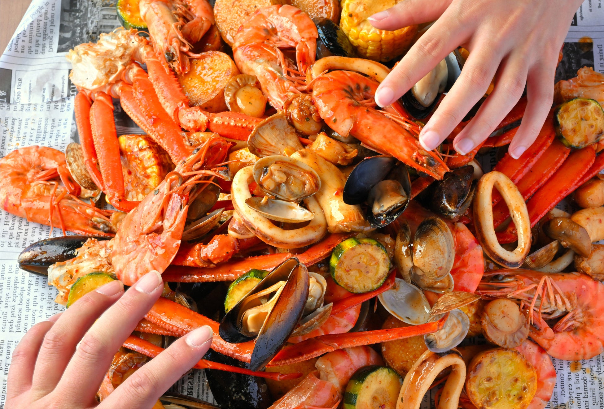 カニ・えび・貝などの豪華海鮮を、お好みのソースでたっぷりと和えて、熱々の状態でご提供します。ビニール手袋を付けて、豪快に手掴みでお楽しみください。