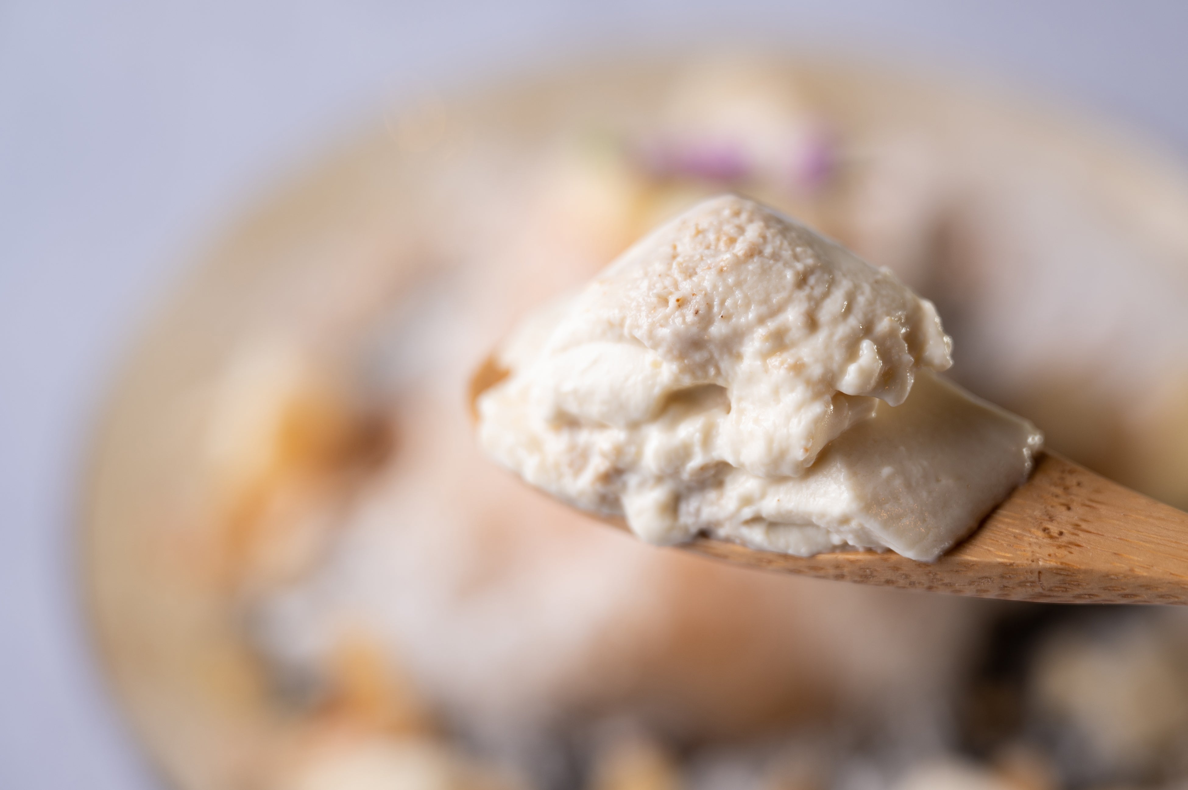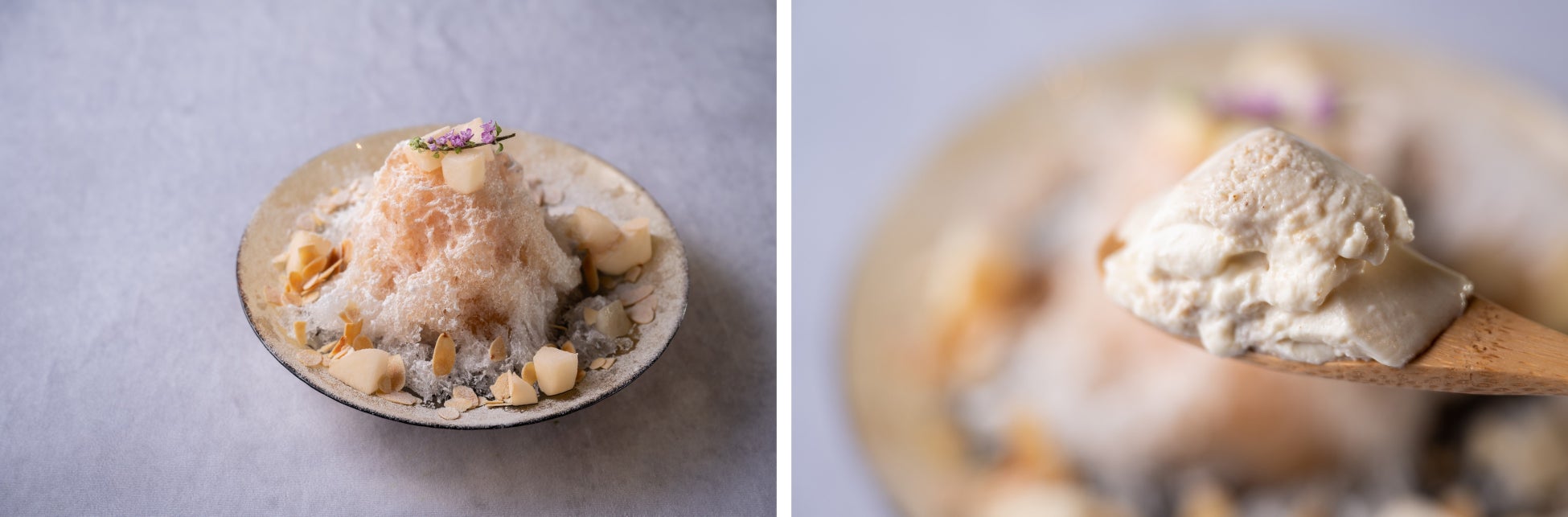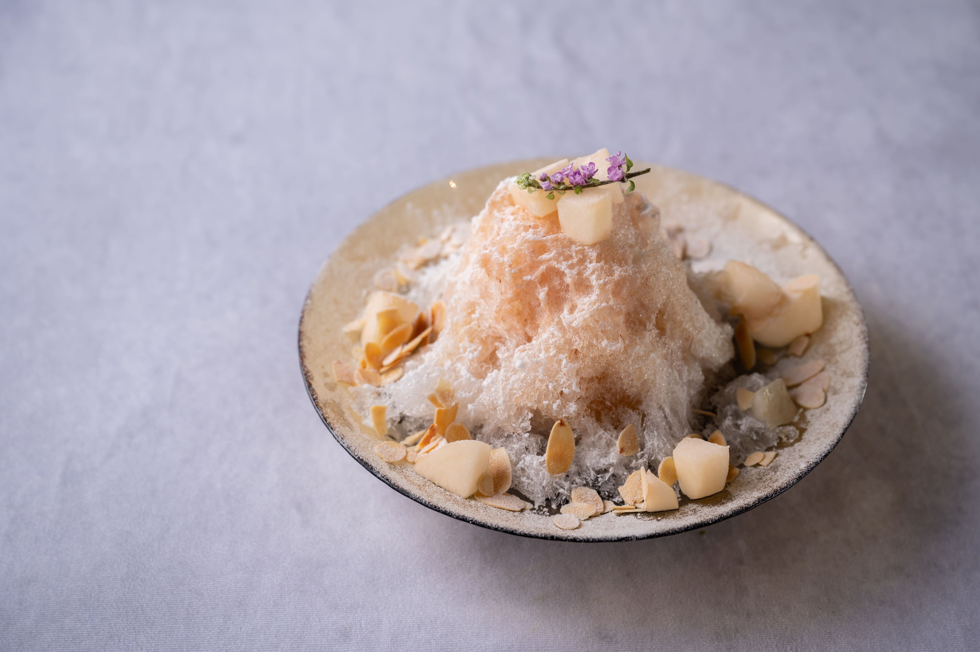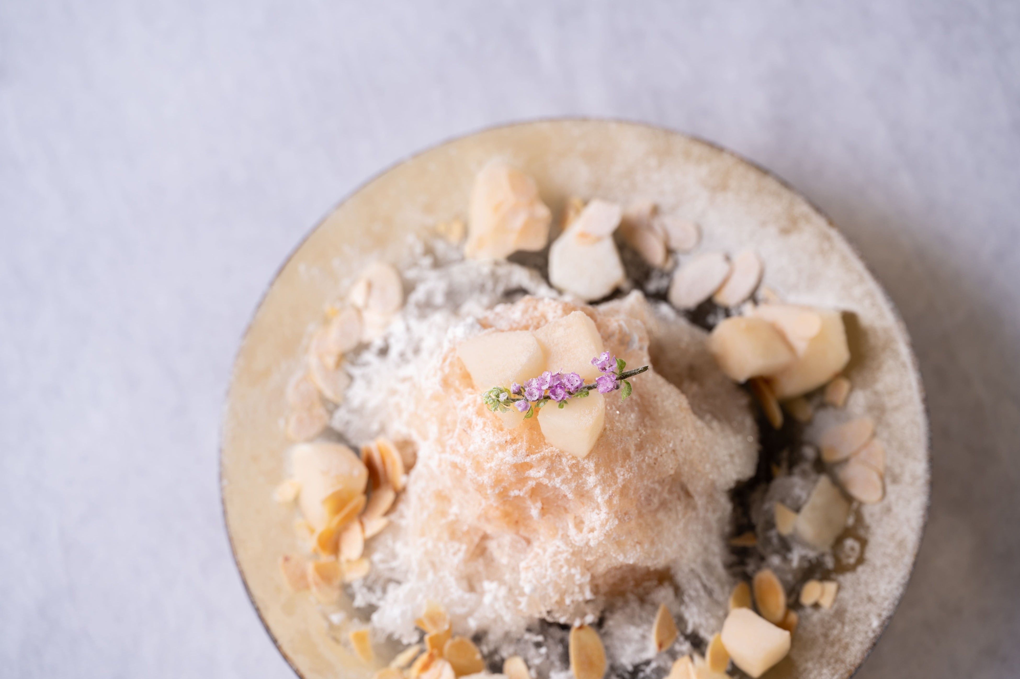 氷の上には、自家製の桃ソースとドイツの老舗紅茶メーカー「ロンネフェルト」のバニラチャイのシロップがかけられています。氷を食べ進めていくと、中から白胡麻のペーストとすりごま、ミルクを使用した胡麻の風味が香ばしいブランマンジェが登場。皿の縁に飾られたアーモンドスライスとともにいただくと、口の中に胡麻とアーモンドの香ばしさがアクセントになり、新感覚の果実感を五感で味わえる一品です。