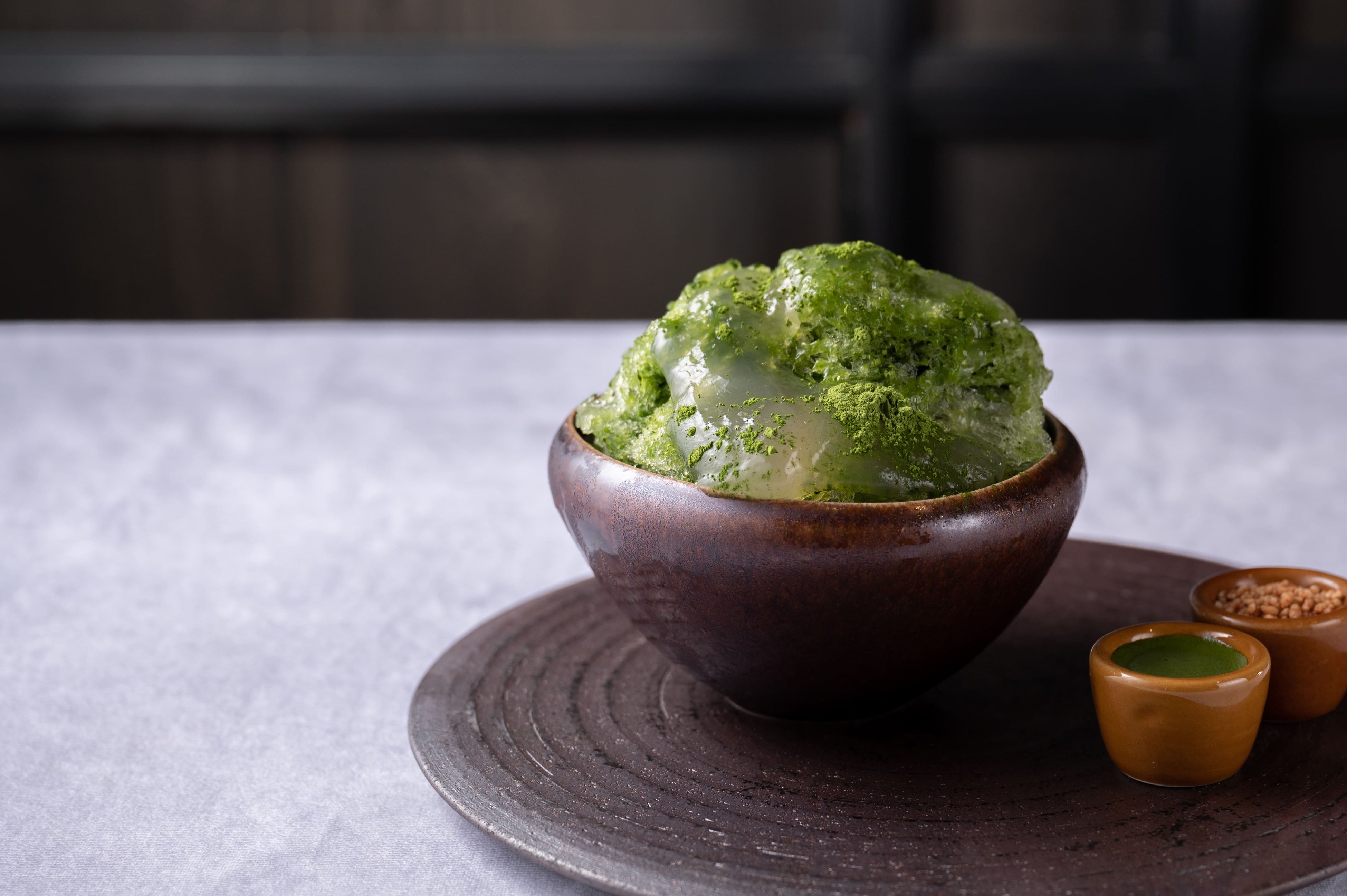 初夏の青葉が茂った木々の蔭を表す“緑蔭”。氷上から零れ落ちる自家製わらび餅の艶やかさから、涼を感じられるような一品に仕上げました。