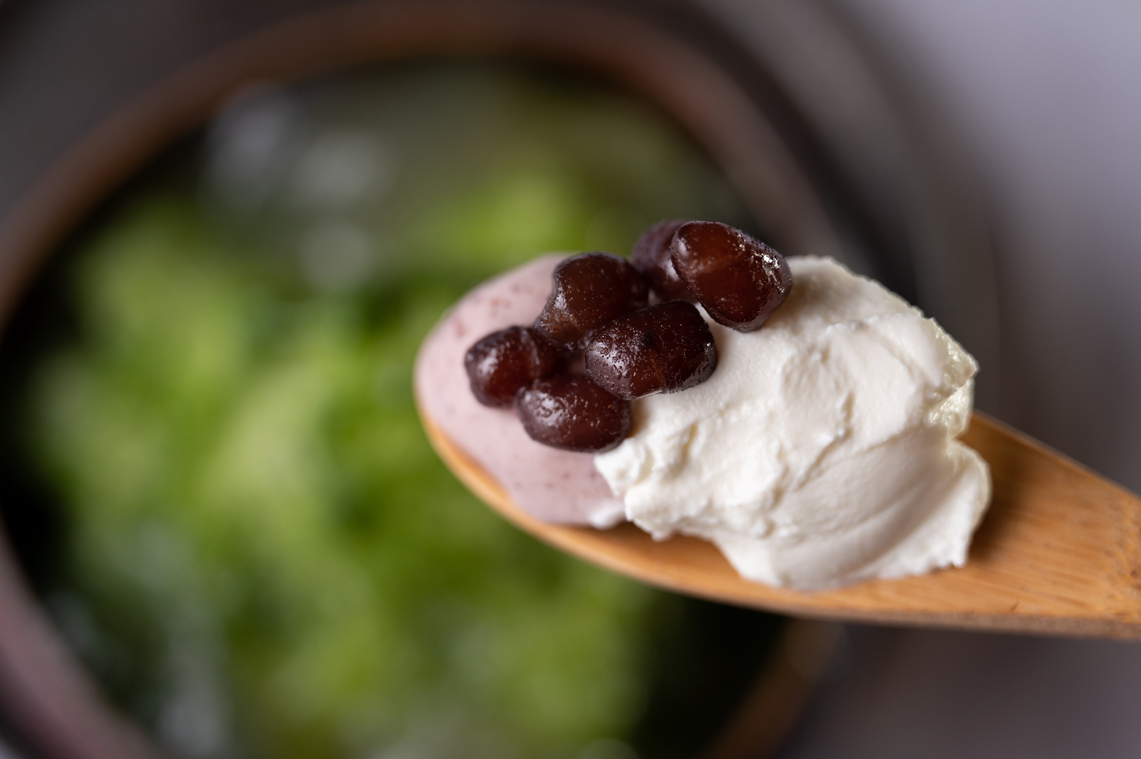 静岡県産の自然豊かな山間地域で栽培された“天空の抹茶”を使用した香り豊かな濃厚抹茶を楽しめる和テイストの氷菓子。甘さ控えめの北海道産大納言かのこ豆と、お赤飯のルーツともいわれる「古代赤米」、国産「黒米」の2種とza you zenの塩をきかせた濃厚北海道ミルクアイスが氷に包まれており、食べ進めていく程深く濃厚な味わいをお楽しみいただけます。味と食感のアクセントに、昨年好評の玄米をお好みでトッピングいただくことも可能です。