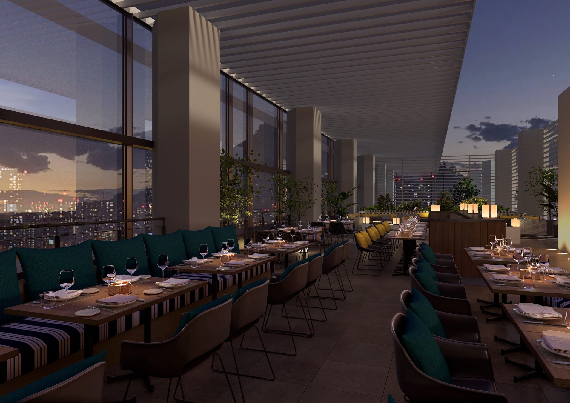 「海中から天空へと誘う旅」をデザインコンセプトに、33階以上に225室の客室を配し、36階には東京ベイエリアの眺望が広がるロビー、レストラン、バー、大浴場を併設。