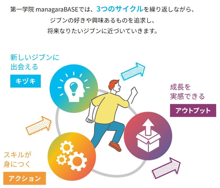 第一学院 managaraBASEは第一学院高校グループの「高校生・大学生のための新しい学びの場」として東京・池袋に2023年に開設。以降、順調に生徒数を伸ばし、2024年4月には大阪・梅田にも開設し今後も順次拡大予定です。