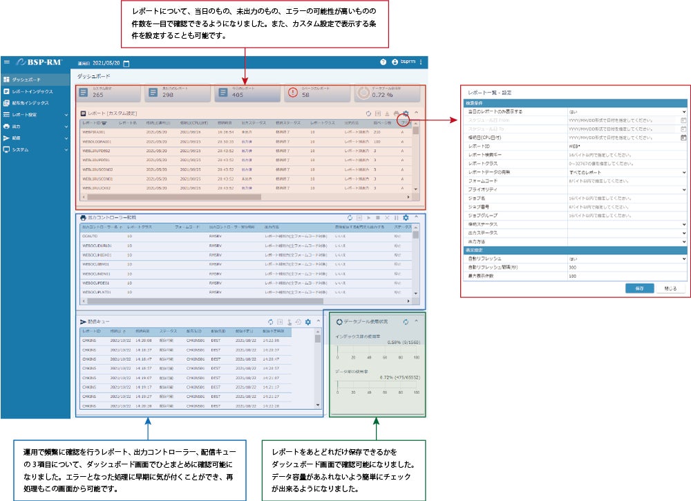 今回リリースした「BSP-RM Ver2.0.0」ではクライアント画面をWebアプリ化し刷新するとともに、ダッシュボード画面を追加し、帳票の出力状況や帳票データ量の確認など、運用でよく使われる機能を一画面で確認・操作が可能になりました。また、帳票の格納・出力・配信の処理のパフォーマンスも、旧バージョンと比較して最大18%向上し、運用の効率化を実現しています。