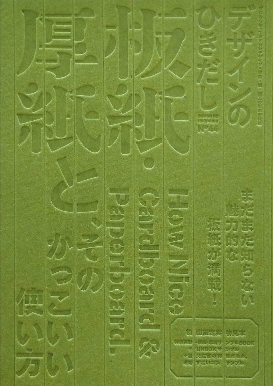 特集は「板紙・厚紙と、そのかっこいい使い方」。名刺やカード、書籍表紙、箱など多く使われる「厚紙・板紙」の情報を種類紹介から真似したい使用例、印刷加工まで徹底大紹介。製本機の限界「50mm厚」の厚紙・板紙実物サンプル帳つき!