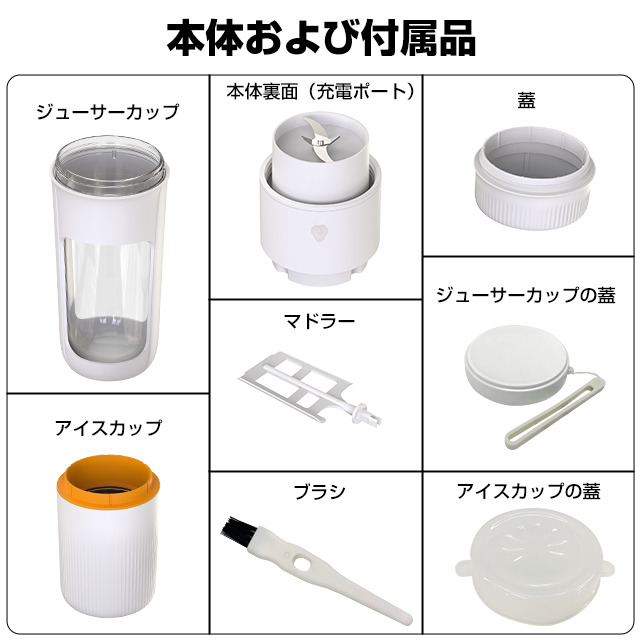※ 満電の状態で340mlのジュースを約11回(毎回40秒)絞り、200mlのアイスクリームを約3回(毎回15分)攪拌することができます。