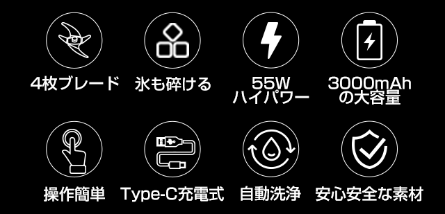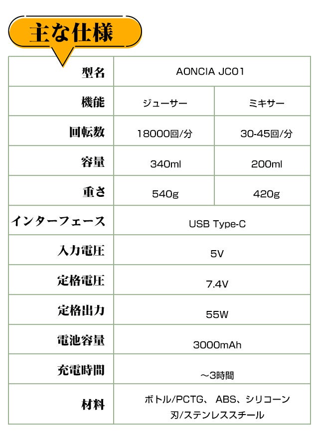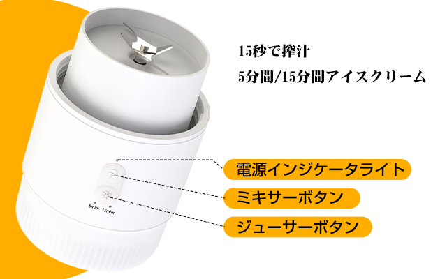 - 榨汁:15秒で新鮮な果物や野菜のジュースが楽しめる。