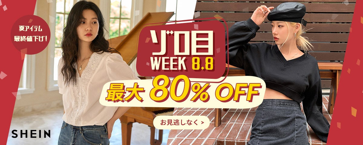 | 最大80%OFF!“ゾロ目WEEK8.8セール”開催! 【開催期間】 8月8日(月)12:00~8月17日(水)12:00 URL:https://jp.shein.com/campaign/jpsale220808 |