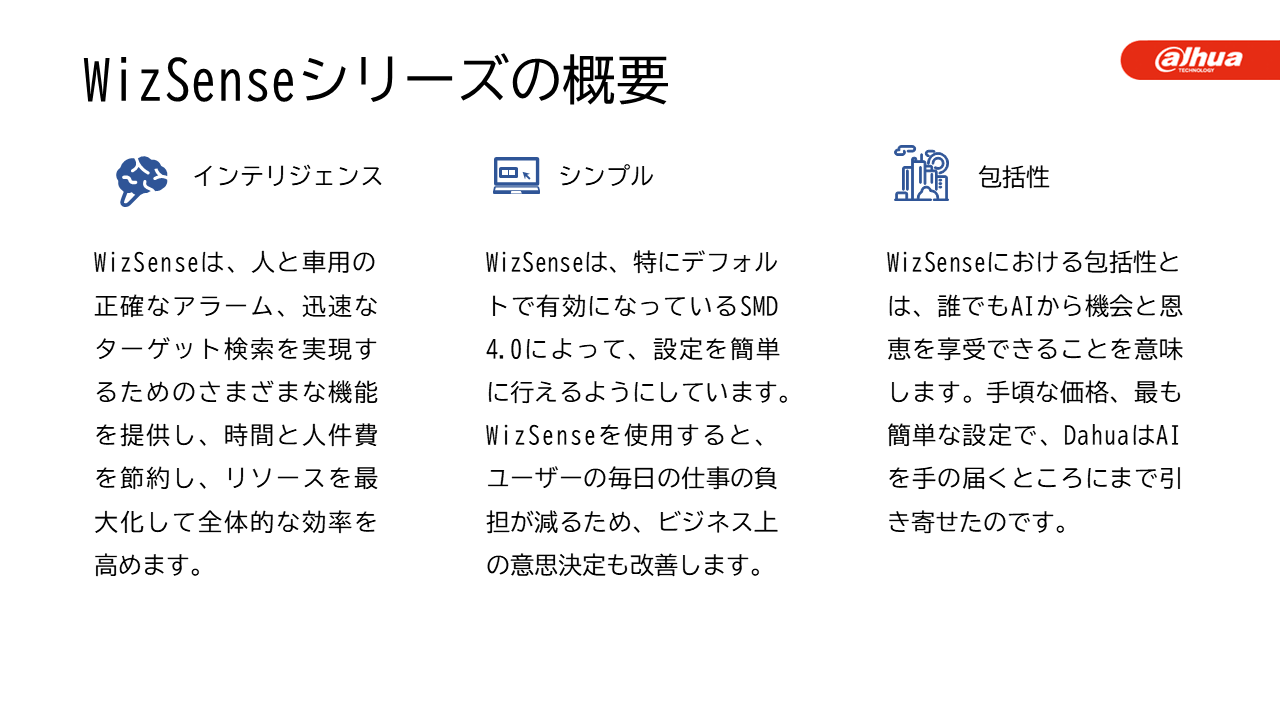 Dahua Technology Japan 合同会社(所在地:東京都中央区、 職務執行者:リー・ビン)は、人間はリアルタイムに監視する注意力が長く続けられないため、AIによるリアルタイム監視に頼ります。より環境に順応、より高い精度、よりスピーディにWizSenseシリーズの新しいAI機能をリリースします。使い方によって、今まで事件発生後の証拠に過ぎない映像がAIの即時判断により未然を防止することが可能になっています。新規高性能AIは2022年6月よりリリースします。