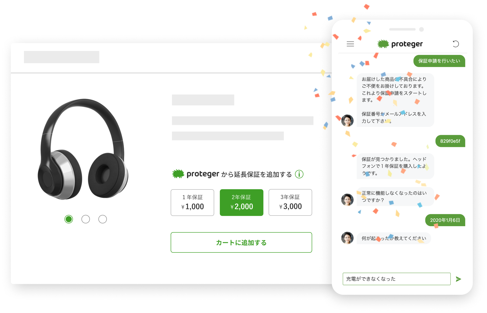 延長保証サービス「proteger」は、保証料による売上高向上、お客さまがECサイトで購入する際の不安軽減などが期待できます。また、お客さまは破損時の申請を簡単に行うことができ、24時間365日いつでもチャットで保証申請が可能となっております。