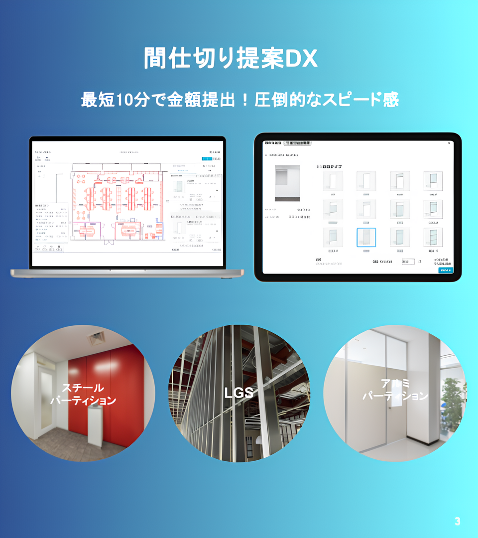 これまで人手と時間を要していた見積業務を大幅に効率化できるツールとなります。まずはスチールパーティションからのサービス展開になりますが、造作壁やクロス材なども今後は見積可能になります。
