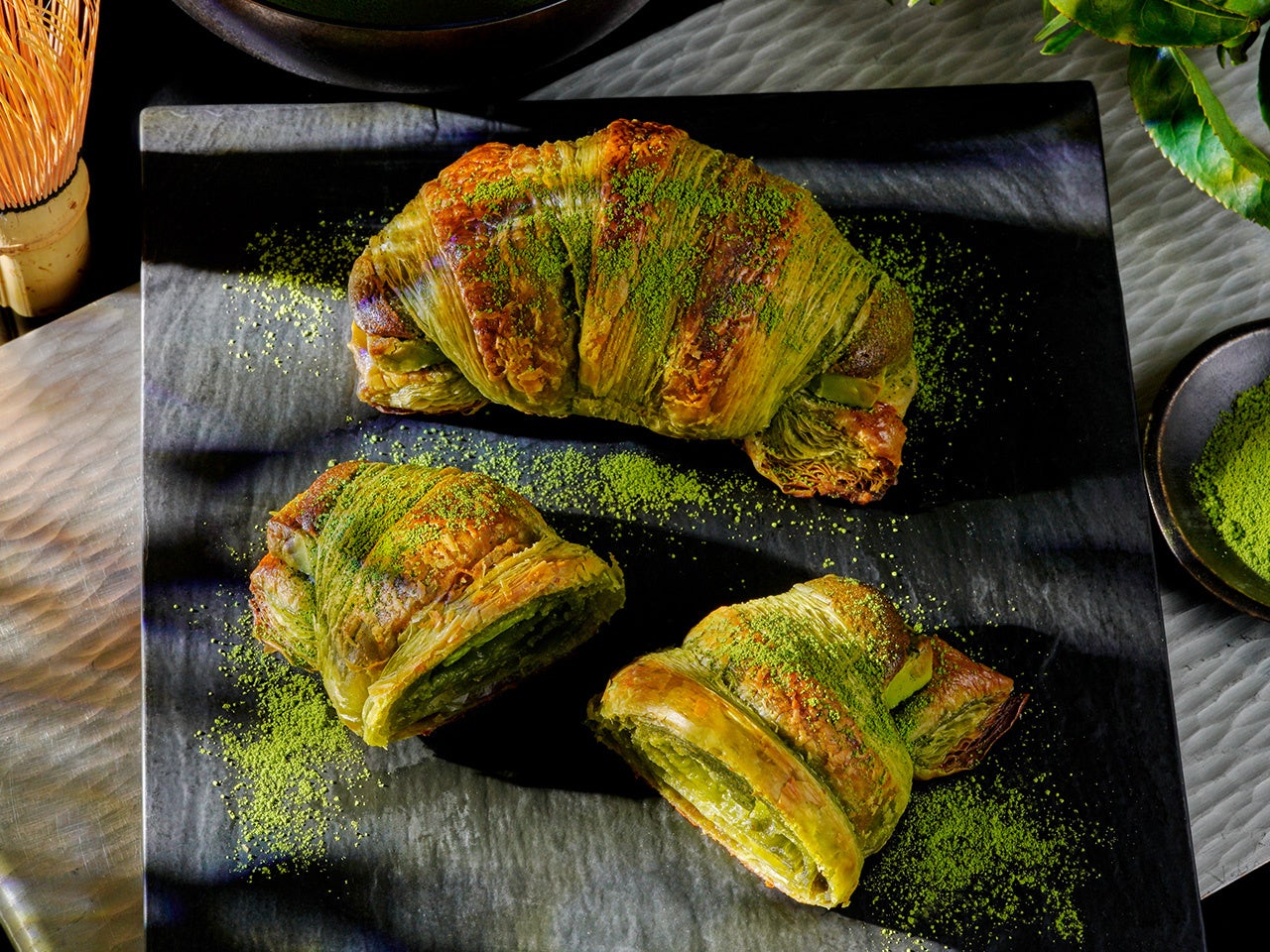 宇治抹茶の味わいを心ゆくまでご堪能いただけるよう、濃厚な味わいの宇治抹茶チョコレートと宇治抹茶入りのケーキ生地を、宇治抹茶を練り込んだサクサクのクロワッサン生地で包み込み、さらに宇治抹茶の粉末をトッピングしました。2021年のコラボ開始以来、「祇園辻利」の宇治抹茶を最も贅沢に使用した、まさに“宇治抹茶尽くし”の商品です。