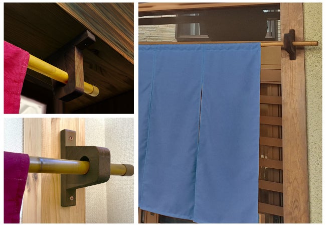のれんを引き立て落ち着きと品格をプラス、こげ茶色の木製のれん掛けで和風空間をワンランクアップ