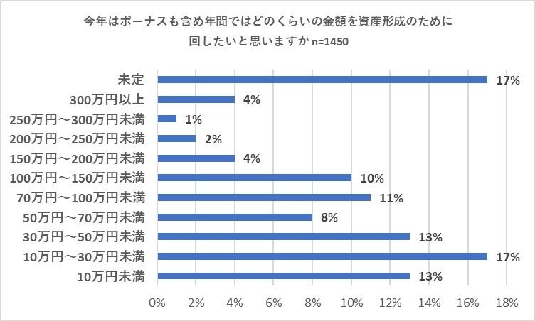 続いて、1,450人に対し「今年はボーナスも含め年間ではどのくらいの金額を資産形成のために回したいと思いますか」と質問。「10万円~30万円未満」と「未定」との回答がともに17パーセントでトップとなりました。それ以下では「10万円未満」と「30万円~50万円未満」との回答がともに13パーセントで続き、「70万円~100万円未満」(11パーセント)、「100万円~150万円未満」(10パーセント)が10パーセント以上の回答を集めました。