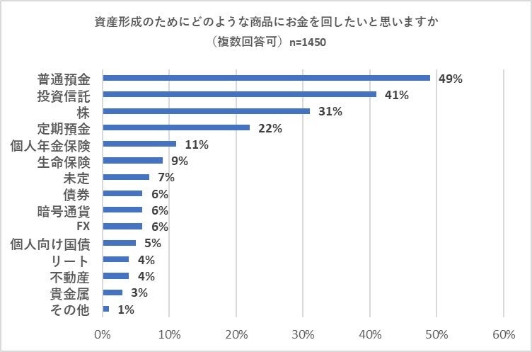 さらに、「目標を立てた」と「目標というほどではないが漠然とした考えはある」と回答した1,450人に「資産形成のためにどのような商品にお金を回したいと思いますか」との質問を複数回答可で行いました。その結果、「普通預金」が49パーセントで最多の回答を集め、「投資信託」が41パーセントで2位、「株」が31パーセントで3位となりました。「定期預金」も22パーセントと多くの回答を集めました。ミレニアル世代に於いても預金志向の高さが明らかになりました。