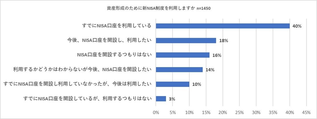 最後に、1,450人に「資産形成のために新NISA制度を利用しますか」と尋ねました。その結果「すでにNISA口座を利用している」との回答が40パーセントでトップ。「今後、NISA口座を開設し、利用したい」との回答が18パーセントで2位、「NISA口座を開設するつもりはない」が16パーセントで3位となりました。全体としてみると、新NISAの利用に前向きと考えられる回答(「すでにNISA口座を利用している」、「今後、NISA口座を開設し、利用したい」、「すでにNISA口座を開設し利用していなかったが、今後は利用したい」)の合計が約7割の68パーセントとなりました。