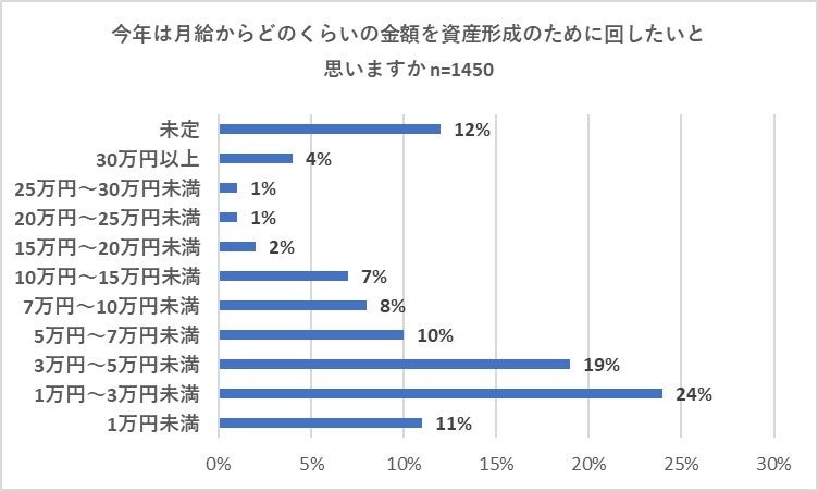 次に、「目標を立てた」と「目標というほどではないが漠然とした考えはある」と回答した1,450人に対し「今年は月給からどのくらいの金額を資産形成のために回したいと思いますか」と尋ねたところ「1万円~3万円未満」との回答が24パーセントで最多となりました。2位は「3万円~5万円未満」が19パーセントで入り、以下は「未定」(12パーセント)、「1万円未満」(11パーセント)、「5万円~7万円未満」(10パーセント)が続きました。過半数の54パーセントの方が「5万円未満」と回答したことがわかりました。