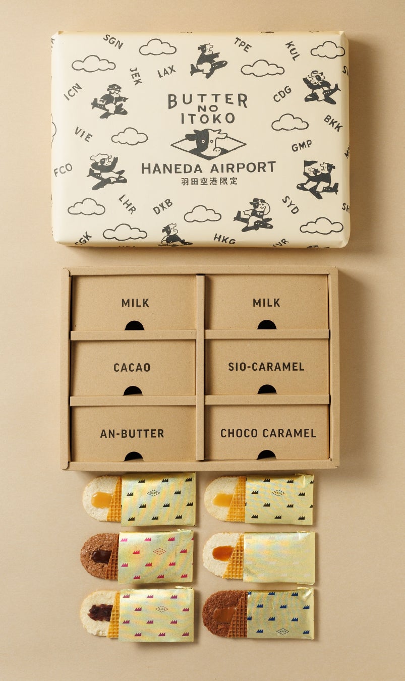 ビターなキャラメルクリームと、フルーティーなカカオの風味感じる「チョコキャラメル」が入った羽田空港限定のご当地BOX。主要都市の空港コードとなるアルファベット3文字と、旅する可愛らしいバターのいとこキャラクター「いとこちゃん」のモチーフを散りばめたポップなデザインが目を引きます。