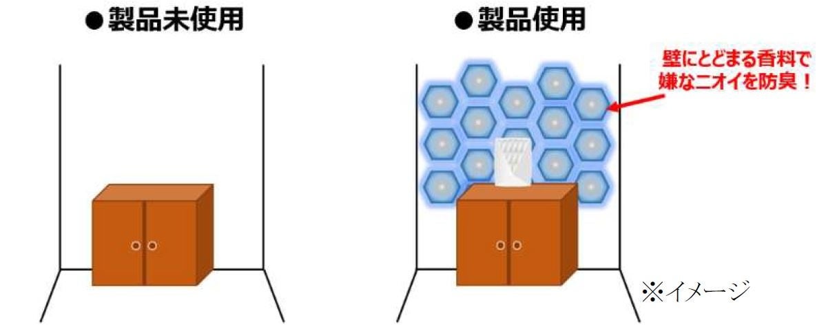 当製品には「防臭香料」が配合されており、香料が空間を消臭しながら、成分を壁にくっつけて防臭し続けます。