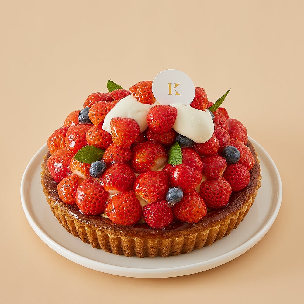 真っ赤なイチゴをふんだんに飾り、ブルーベリーをアクセントにした、ひときわ鮮やかなタルトです。