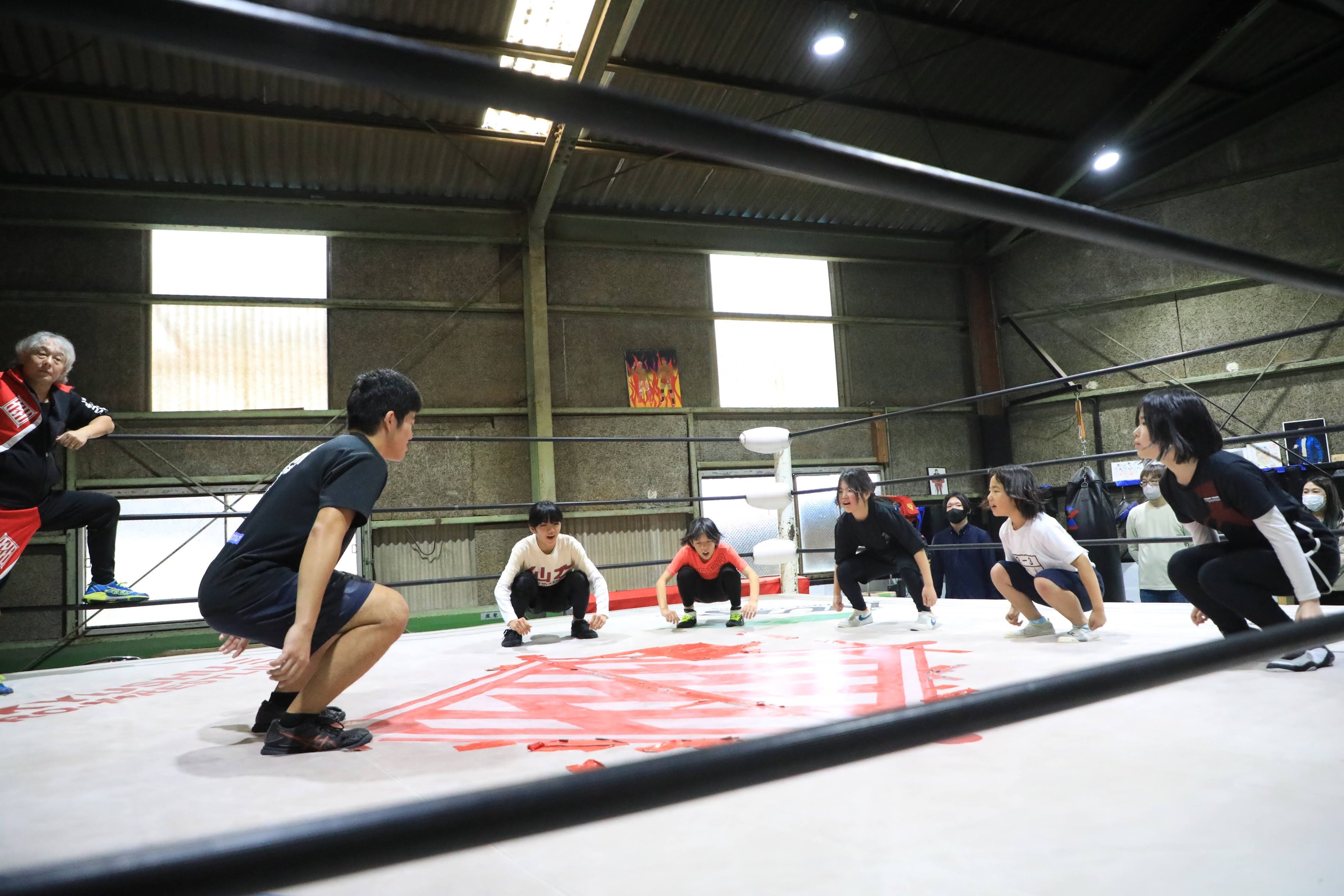 リング上での基礎運動や簡単なトレーニングを体験し、プロレスに触れる時間を過ごしました。