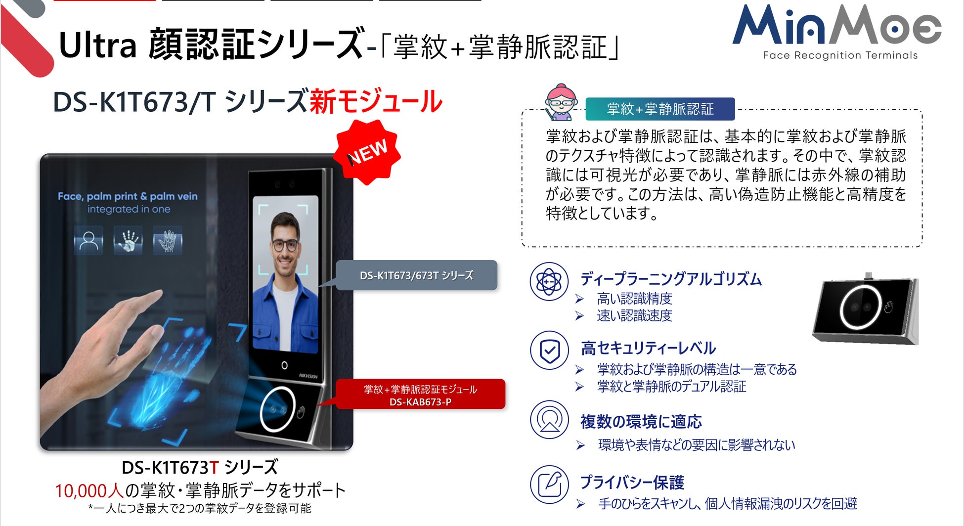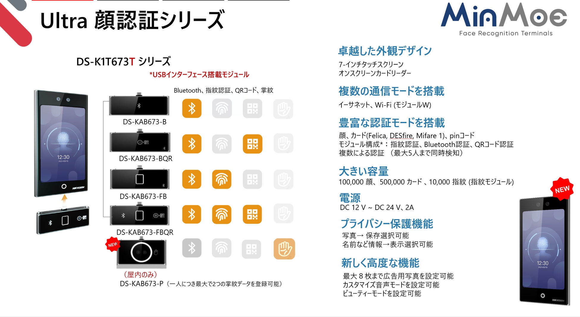 Hikvision は、2020年に「MinMoe」顔認証シリーズを発表して以来、生体認証技術の革新をリードしており、現在は虹彩認証や顔・手のひら認証技術を組み合わせた高度なアクセス制御ソリューションを提供しています。今年、DS-K1T673シリーズ+DS-KAB673-PのUSBインターフェースモジュールを販売開始いたしました。