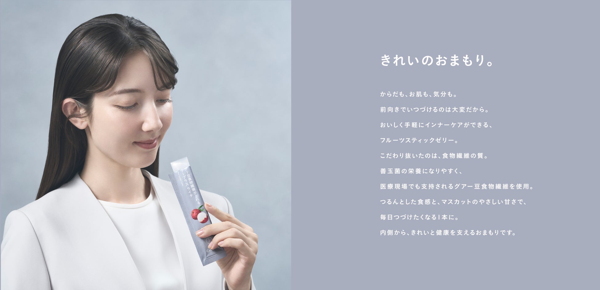 不足しがちな食物繊維を、おいしく・手軽に補えるスティックタイプのゼリー。フレーバーは、やさしい甘さのライチ・マスカットの2種類です。つるんとした食感と、フルーティーなおいしさが特長で、忙しい日々の合間に無理なくつづけられます。さらに、1本あたり18kcal以下・脂質ゼロのため、小腹がすいた時に、罪悪感なく取り入れられるインナーケアアイテムとして、多くのお客様からご支持をいただいております。