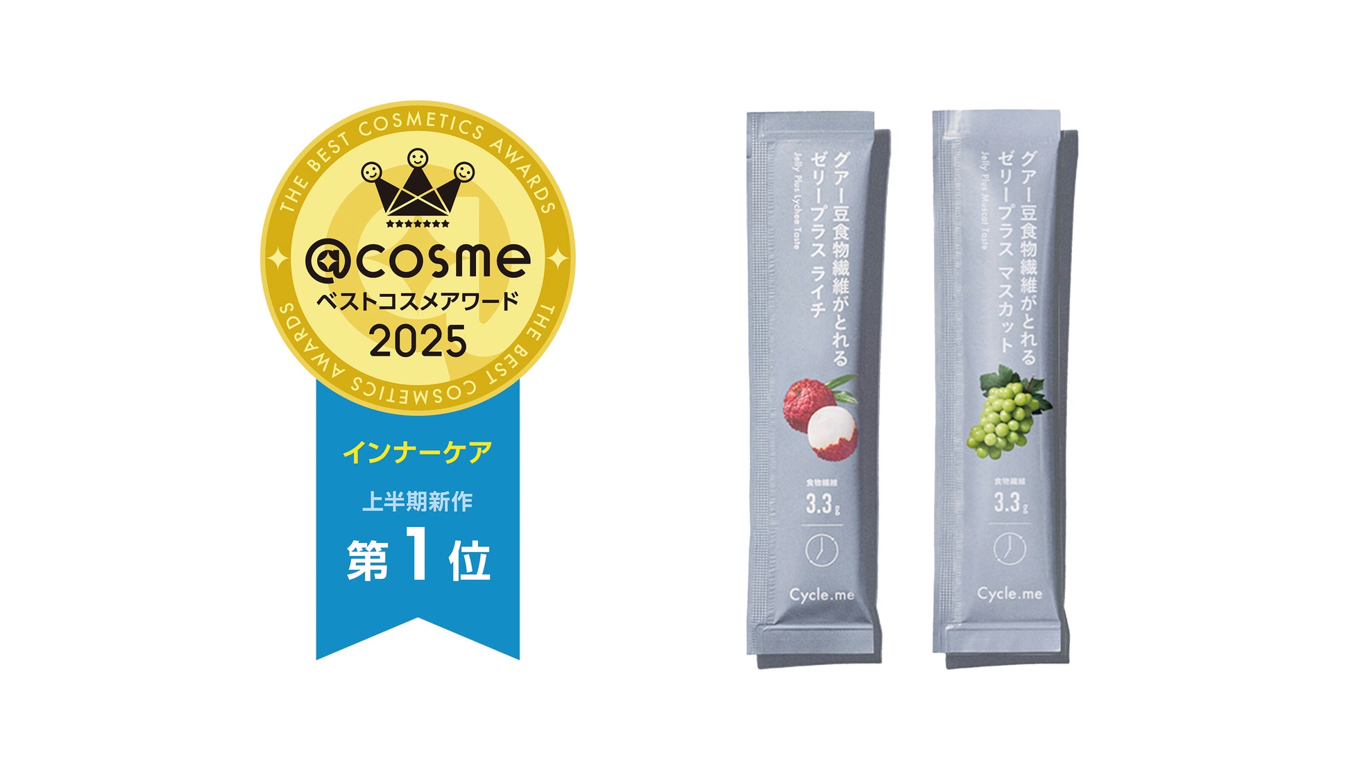 株式会社ドットミー(所在地:東京都千代田区 / 代表取締役社長:知念孝祥ジョナサン)が展開するウェルビーイングブランド Cycle.me(サイクルミー)から2024年12月に新発売した「グアー豆食物繊維がとれるゼリープラス」が、この度『@cosme上半期新作ベストコスメアワード2025』にてベストインナーケア第1位を受賞いたしました。
