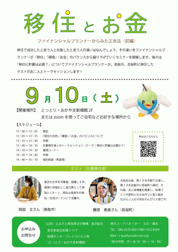 移住で成功したと思う人と失敗したと思う人の違いはなんでしょう。そこで公益財団法人ふるさと鳥取県定住機構(本所:鳥取県鳥取市、理事長:森谷邦彦)は、その違いをファイナンシャルプランナーが「移住」「環境」「お金」のバランスから掘り下げていくセミナーを開催します。後半は「移住に貯蓄は必要?」についてFPが鳥取市、若桜町に移住したゲストのお二人とトークセッションします。