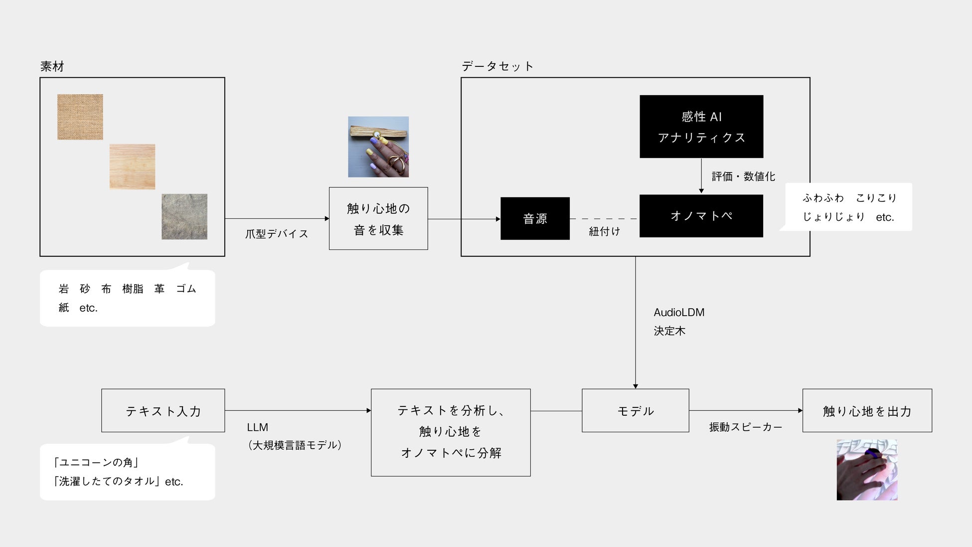 そこで我々はユーザーが入力した言葉から触り心地を生成し、フィードバックするシステムの開発に着手しました。