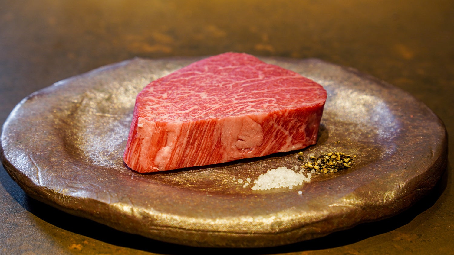 前脚のスネ部分に隠れている、旨味ぎっしりで歯切れが良い柔らかな部位「ちからこぶ」。最高級の「ヒレ」、「ミスジ」とともに、希少部位3種の食べ比べが楽しめる盛り合わせです。