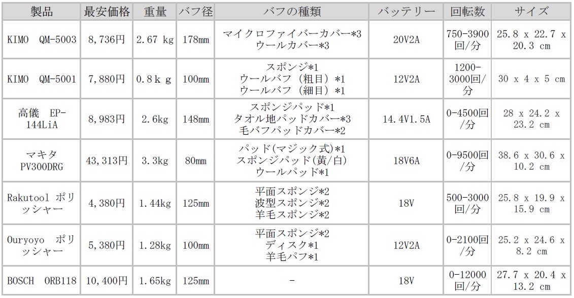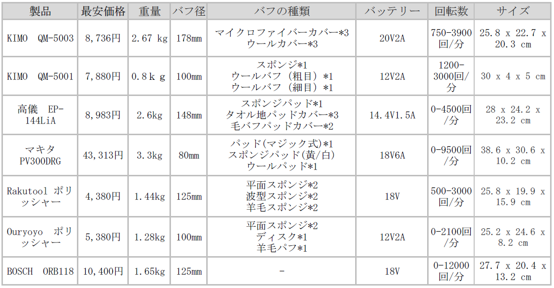 自分の手で愛車をピカピカにすることができるため、今回は色々な他社の人気充電式ポリッシヤーの詳細情報と比較して、コスパ最高のポリッシャーQM5003をご紹介します。
