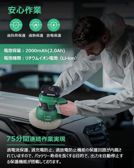 KIMOポリッシャーQM5003は他社より大容量のバッテリーを使って、コンセント式に近い連続作業時間75分間を実現しました。作業効率が3倍アップできます。