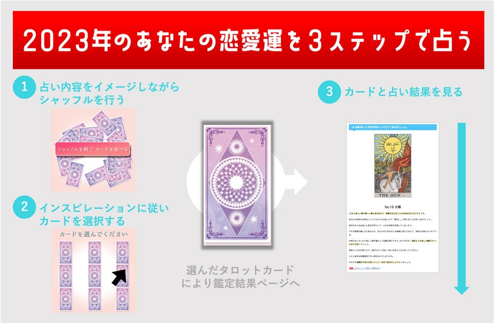 利用者は、自身の「2023年恋愛運」をタロット占い機能により占うことができます。このタロット占いはワンオラクル方式(1枚のカードを選ぶ占い方法)で行い、シャッフル後に展開された9枚のなかからインスピレーションを得た1枚を選ぶことで占うことができます。
