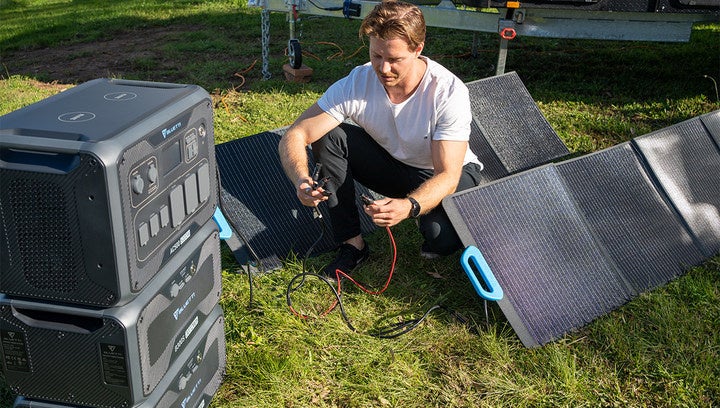 3. B300Sを2台以上接続し、AC(家庭用コンセント)とPV(ソーラー発電)のデュアル充電ができます。最大8,000Wの入力で、1.8~2.3時間でフル充電ができます。