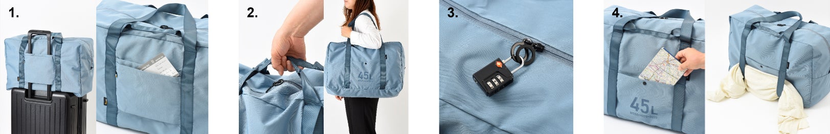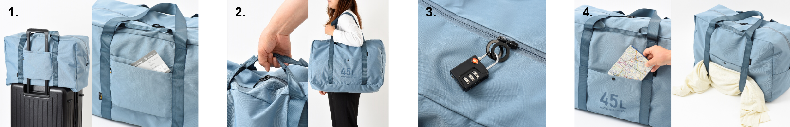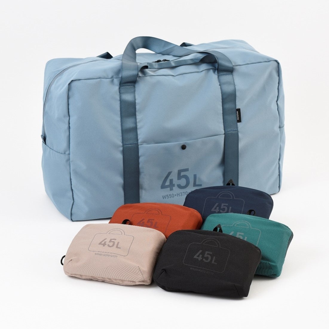 35L・45Lともに機内持ち込みできる大容量サイズで、さっと広げて使える折りたたみボストンバッグ。