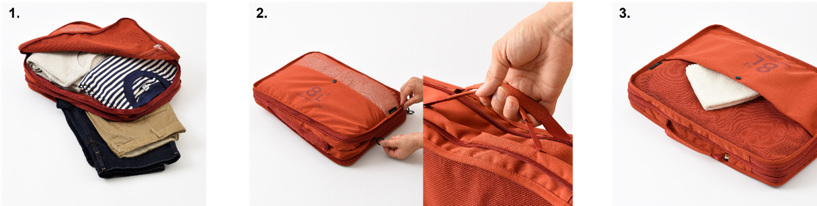 2. かさばる荷物をすっきりさせるファスナー式の圧縮機能付き。圧縮前でも、後でも快適に持ち運べる2つのハンドルを搭載。